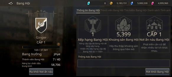 Bang hội là một tính năng xã hội và cộng đồng cốt lõi, nơi người chơi có thể tập hợp, hợp tác và cùng nhau phát triển, mang lại nhiều lợi ích và trải nghiệm độc đáo. Thành viên thuộc Bang Hội có thể xem danh sách bang hội, các thông báo bang hội, và thông tin trạng thái của các thành viên khác. Ngoài ra còn có thể đóng góp Vàng và Điểm Danh vọng để tăng điểm kinh nghiệm Bang hội (Guild EXP).