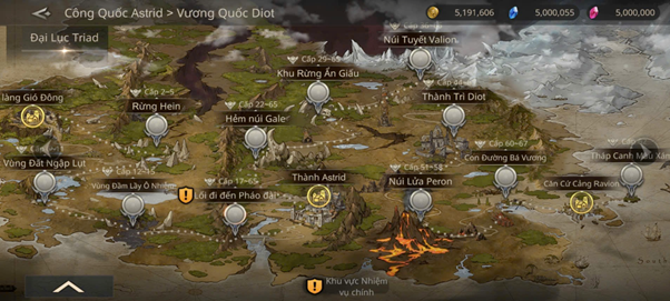 Trò chơi có một hệ thống bản đồ phong phú, bao gồm các khu vực chính và các Hầm ngục đa dạng. Các khu vực chính trên bản đồ thế giới bao gồm: Vương Quốc Diot, Làng Gió Đông, Rừng Hein, Vùng Đất Ngập Lụt, Vùng Đầm Lầy Ô Nhiễm, Lối Đi Đến Pháo Đài, Hẻm Núi Gale, Khu Rừng Ẩn Giấu, Thành Astrid, Núi Tuyết Valion, Thành Diot,và các loại Hầm ngục khác nhau.